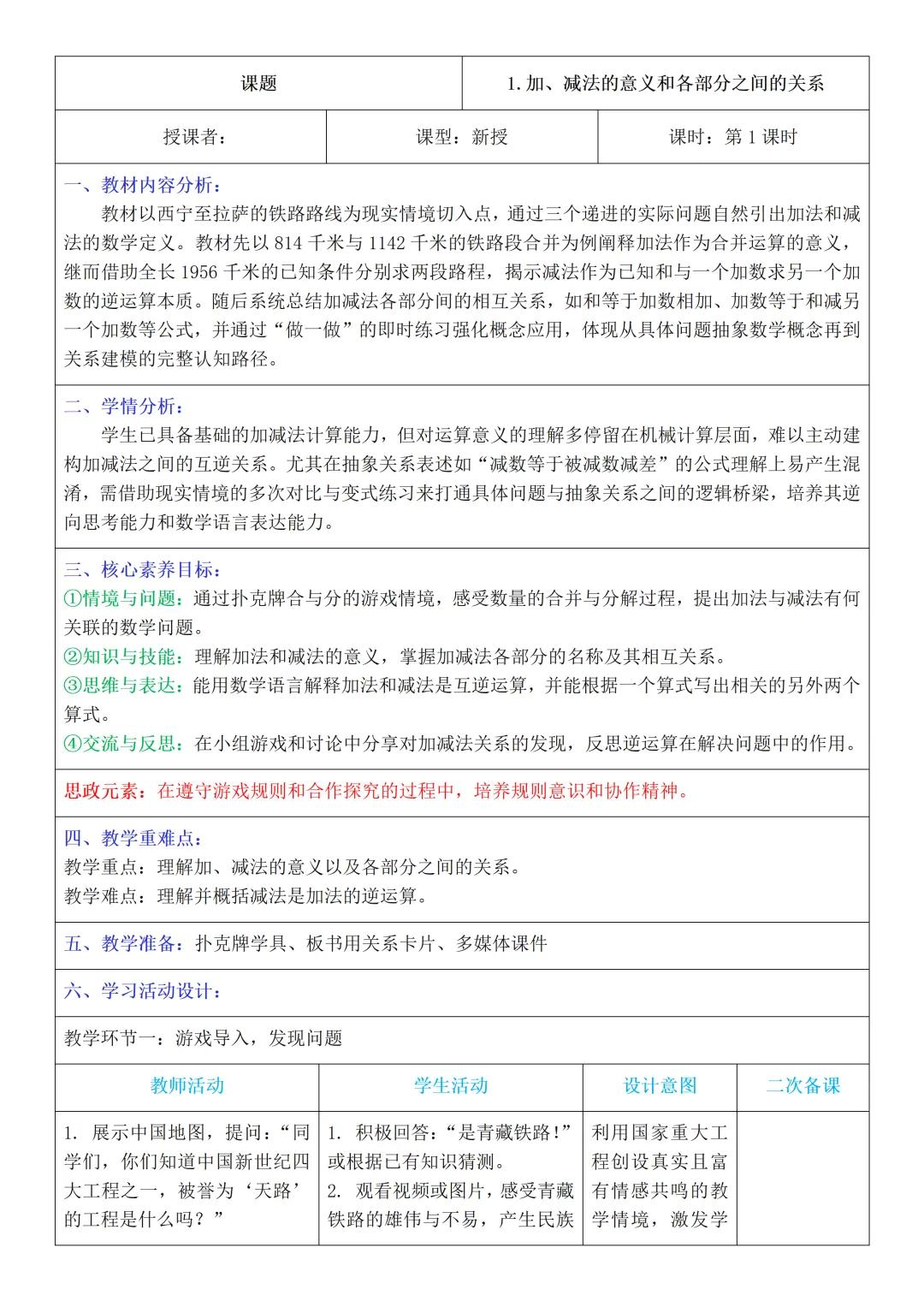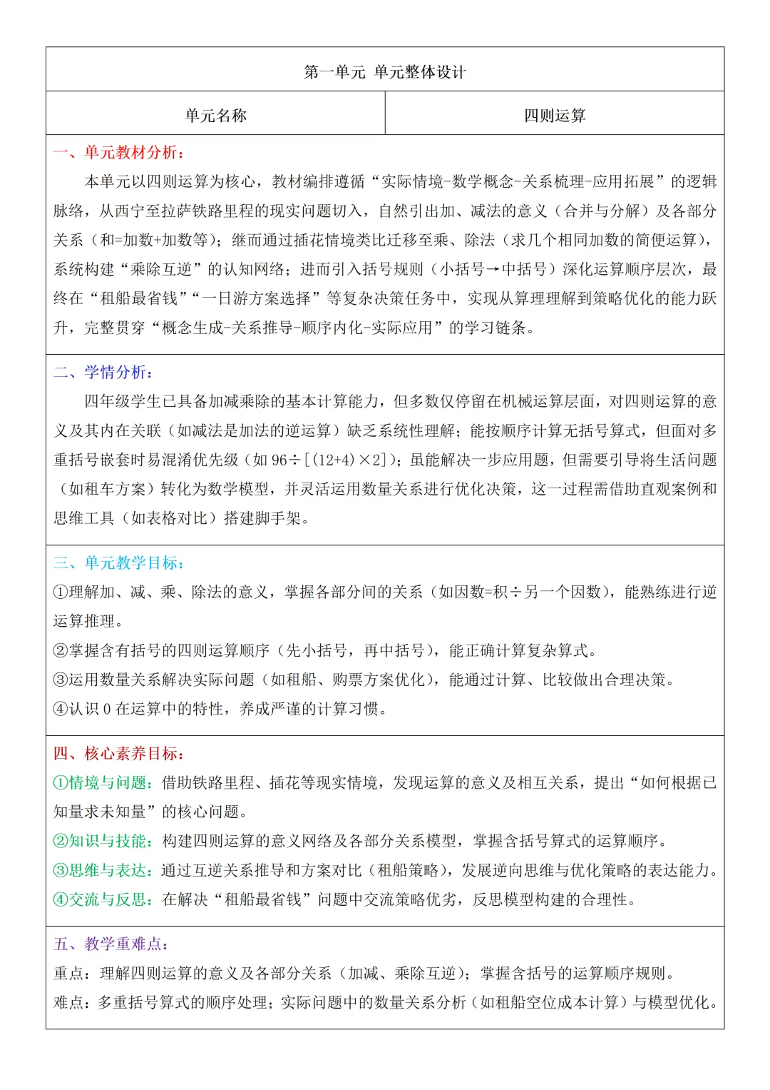 人教版数学四年级下册核心素养教案含反思+单元整体设计共3套