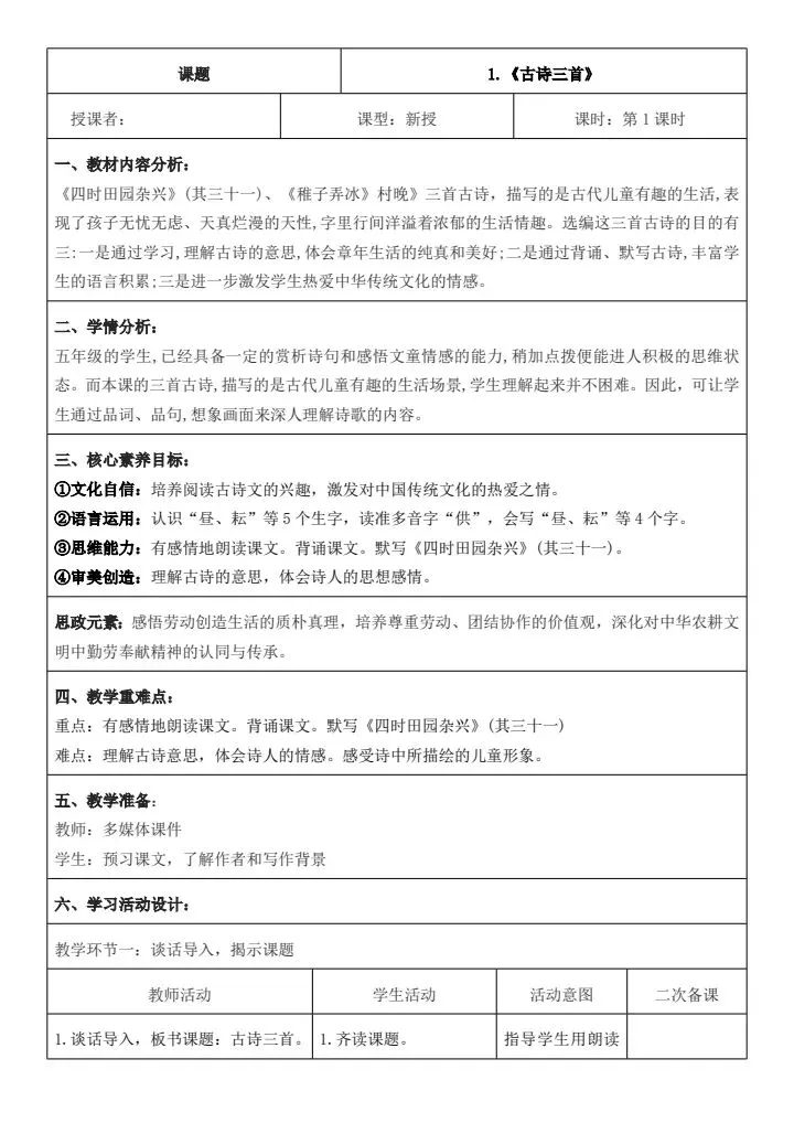 人教版语文五年级下册核心素养教案含反思+思政元素2套2026春,可下载编辑!