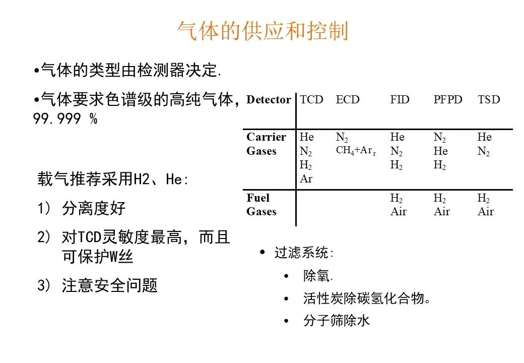 常用的载气有氮气和氢气,也有用氦气、氩气和空气。载气的净化,需经过装有活性炭或分子筛的净化器,以除去载气中的水、氧等不利的杂质。流速的调节和稳定是通过减压阀、稳压阀和针形阀串联使用后达到。一般载气的变化程度。
