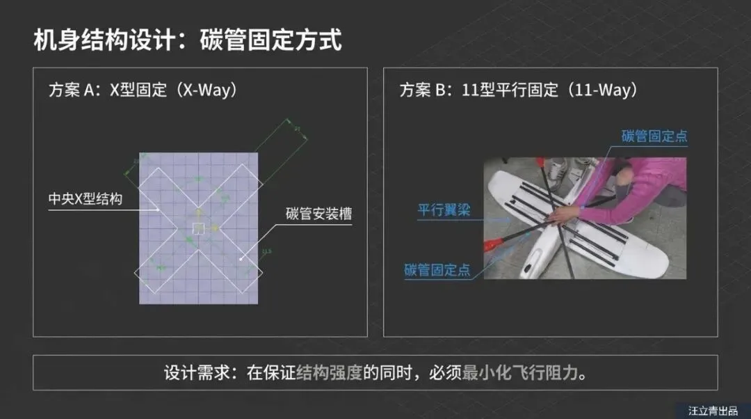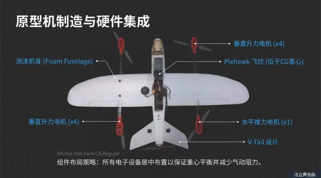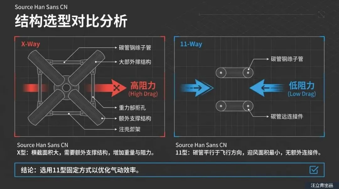 为了彻底打破这个过渡期极易失控的魔咒,韩国亚洲大学的研究团队抛弃了那些复杂且沉重的倾转旋翼机制,提出了一套极其聪明的极简爆改方案。他们决定在传统的固定翼机身上,利用碳纤维杆额外加装四个垂直起降电机。这里面最核心的黑科技在于,他们没有随大流采用传统的“X型”交叉固定架,而是经过精密的空气动力学计算,采用了一种平行的“11字型”碳纤维杆布局。别小看这外观上的微调,当无人机水平向前冲刺时,这平行的“11字型”支架迎风面极小,能大幅削减飞行时的空气阻力。不仅如此,这种结构自带极强的稳定性,根本不需要额外安装复杂的支撑架,变相给无人机狠狠减了一波重。