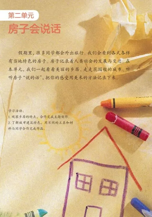 本单元属于“造型·表现”与“设计·应用”相结合的艺术实践,以“房子会说话”为主题,通过《美丽乡居》和《花园城市》两个递进式课例,引导学生从乡村走向城市,观察不同环境中房子的造型特点与文化内涵。学生将从欣赏不同地域的乡居建筑入手,感受乡居与自然环境和谐共生的美感;继而观察城市建筑与花园景观的搭配,尝试用立体或平面的形式表现城市风貌。在此过程中,学生不仅学习用线条、色彩、剪贴、立体制作等方法表现房子,更理解房子是地域环境与文化生活的综合体现,感受建筑背后的人文温度,培养观察生活、热爱家园的情感。