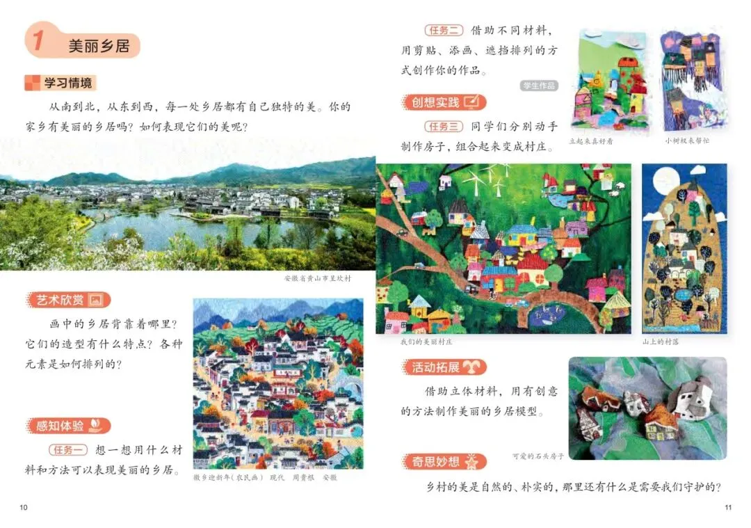 本课是单元的起始课,引导学生走进乡村,观察不同地域乡居的造型特点与文化韵味。教材通过呈现安徽呈坎村、徽乡农民画等素材,让学生感受乡居与自然环境和谐共生的美感。基本问题聚焦于“乡居有什么特点?如何表现它们的美?”学生需要学习的核心知识与技能包括:观察乡居的屋顶、墙体、门窗等基本结构,学习用线条勾勒轮廓、用色彩表现美感,尝试用剪贴、添画、遮挡排列等方式创作乡居作品。通过此过程,实现价值引导:引导学生感受乡村生活的质朴与美好,培养对家乡、对自然的热爱之情。