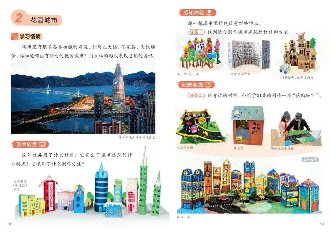 本课是单元的总结课,引导学生从乡村转向城市,观察城市中带有花园元素的建筑与环境。教材以深圳湾夜景、立体城市作品等素材,展示城市建筑与绿化景观的和谐搭配。基本问题聚焦于“如何用立体的形式表现花园城市的美?”学生需要学习的核心知识与技能包括:观察城市建筑的特点,选择合适材料进行立体制作,与同学合作完成组合作品。通过此过程,实现价值引导:让学生了解花园城市建设与生活品质的关系,树立爱护环境、美化家园的意识。