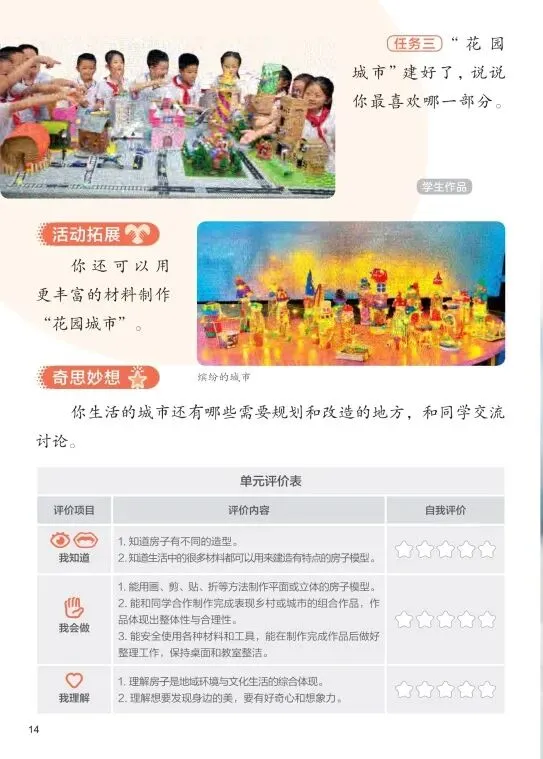 艺术表现:掌握用线条勾勒房子轮廓、用色彩表现房子美感的基本方法;能运用剪贴、添画、遮挡排列等方式创作乡居作品;能用身边的材料和同学合作完成“花园城市”立体作品。