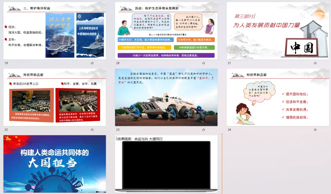 从“养活世界20%人口”到“蓝盔部队维和”,再到“全球气候治理”,既展现国家贡献,又通过“中国参与国际事务对我们有何影响?”引发学生深层思考,强化家国认同与全球视野。