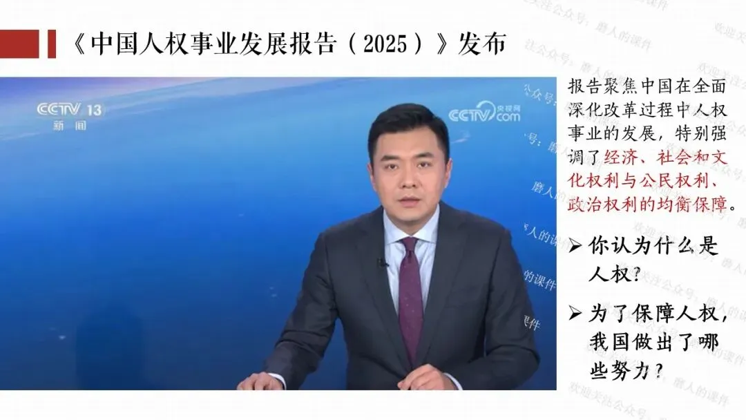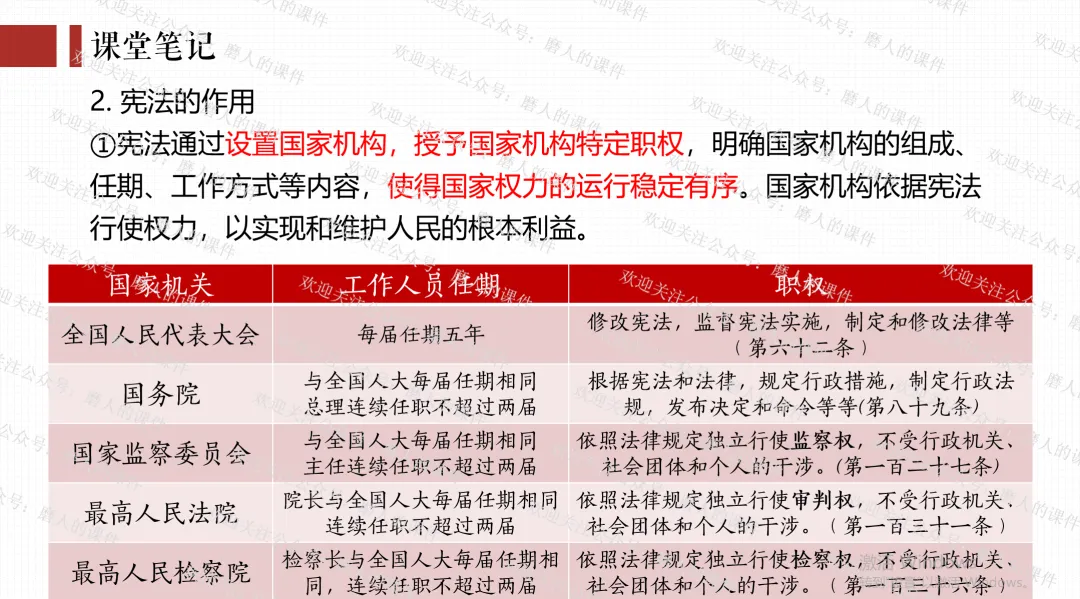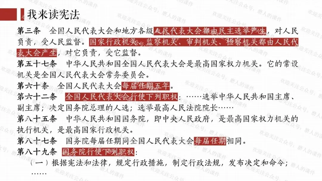 我以视频“感受宪法的力量”导入课题,通过细读宪法目录,学习宪法的内容;再通过了解人民代表大会、读宪法相关章节、法律知识抢答活动,学习宪法设置国家机构、是根本法;再通过《中国人权事业发展报告》,了解国家人权行动计划,学习宪法保障人权;再通过2026年反腐专题片、探究性问题,学习宪法规范权力运行。最后呈现本课知识框架。课件逻辑清晰,素材丰富,兼具知识讲授和价值引导。