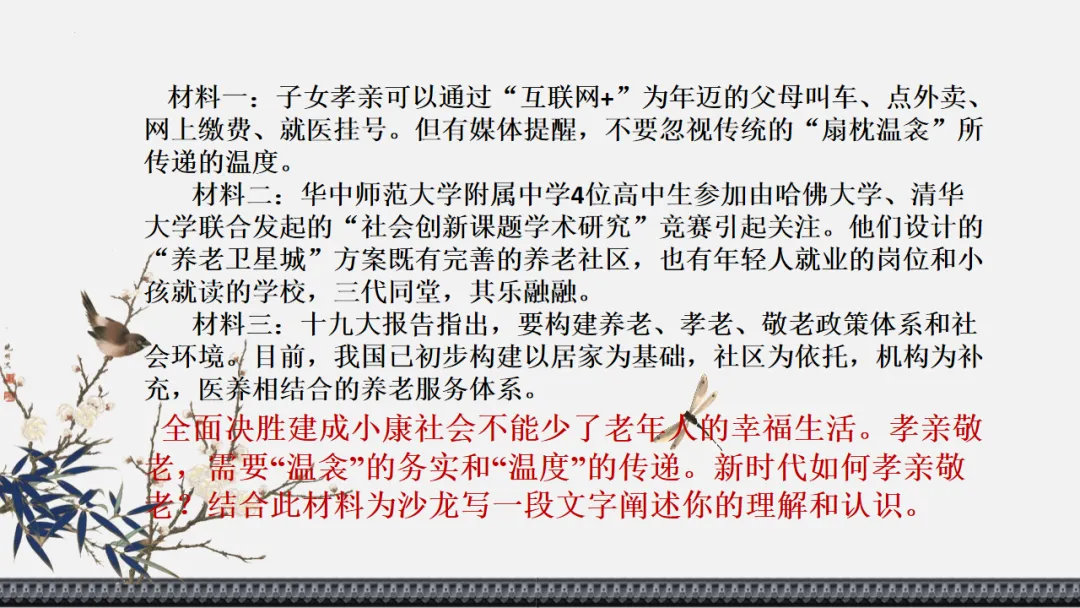 材料一:子女孝亲可以通过“互联网+”为年迈的父母叫车、点外卖、网上缴费、就医挂号。但有媒体提醒,不要忽视传统的“扇枕温衾”所传递的温度。