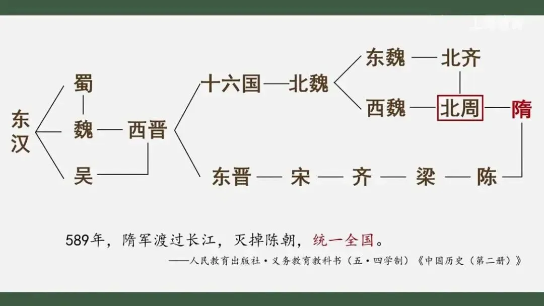 他为何急于表明自身汉族的身份,以及隋朝对汉魏旧制的继承呢?显然,杨坚并不满足于当一个接替了鲜卑政权、坐拥半壁江山的北方皇帝。极力标榜隋朝为汉族政统,正透露了他企图名正言顺统一南北的野心。杨坚的抱负在589年得以实现,隋军渡过长江,很快就灭掉了陈朝,统一全国。至此,杨坚完成了再造统一的伟业。中国历史在经历了长期的分裂后,再次实现了统一。