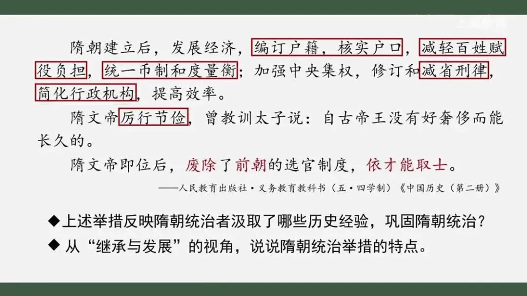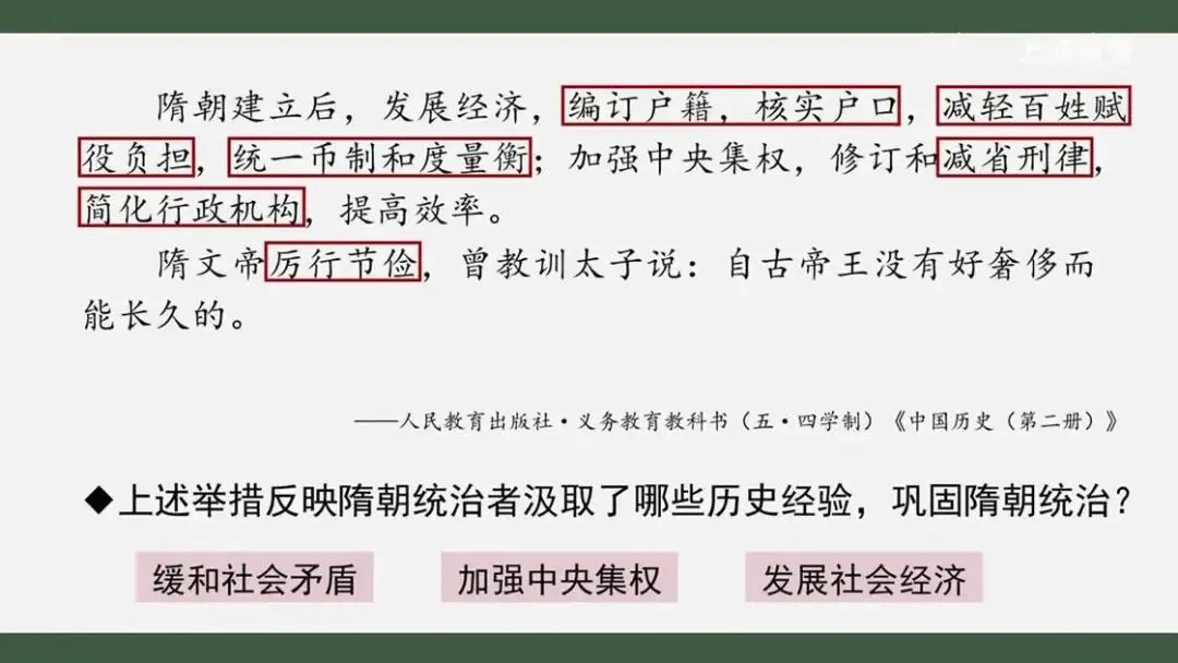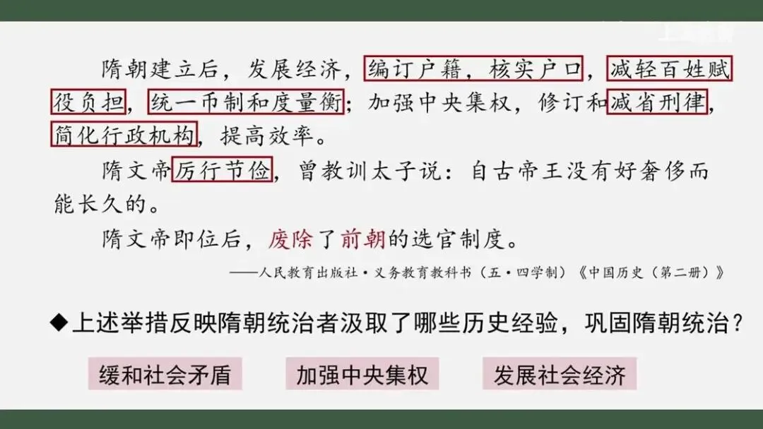 不知道同学们发现没有,这其中的不少举措我们并不陌生。它们与隋之前的王朝采取过的一些措施十分相似。我们能不能结合之前的学习,说说上述举措反映了隋朝统治者对哪些历史经验的汲取?这些举措对巩固隋朝统治能够起到哪些作用呢?