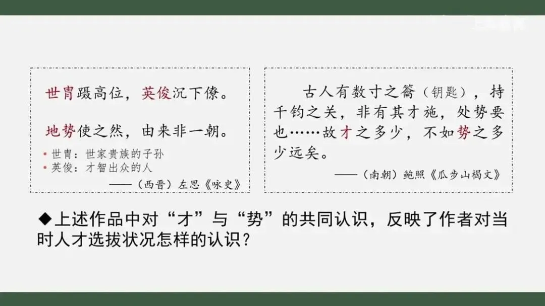 这两个作品分别创作于西晋和南朝时期。但从作品中看,地势使之然,才之多少不如势之多少。这两位作者显然存在不少共鸣,他们都在感叹门第比才华重要得多。这种共同认识反映了作者对当时人才选拔状况的思考。
