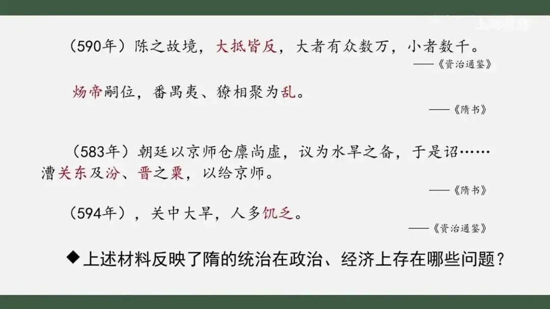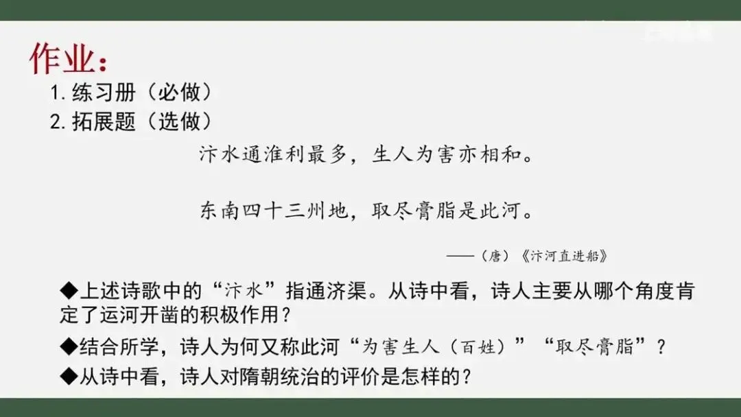 最后,本课还有一个作业,请大家思考:历史上,隋的统治为后世留下了丰厚的物质和制度成果,其迅速灭亡更引发了后世对隋朝统治的反思。