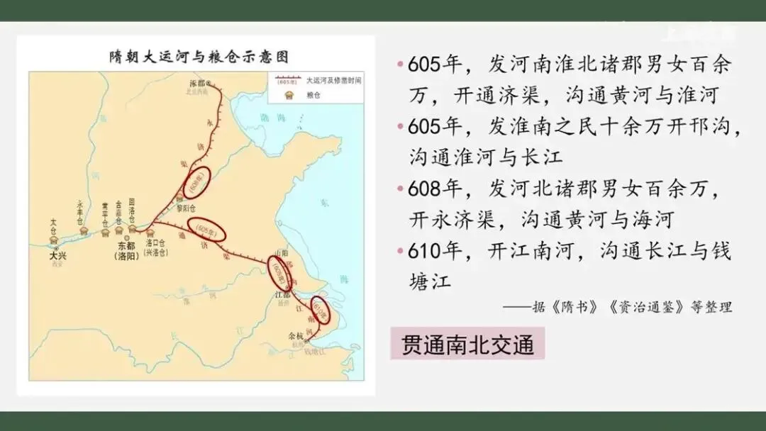 公元605年,隋炀帝首先发河南诸郡男女百余万开通济渠,沟通黄河与淮河,同时又发淮南10余万百姓开邢沟,沟通长江与淮河。608年,又令河北诸郡男女百余万开永济渠,沟通黄河与海河。610年,隋炀帝又下令开江南河,沟通长江与钱塘江。