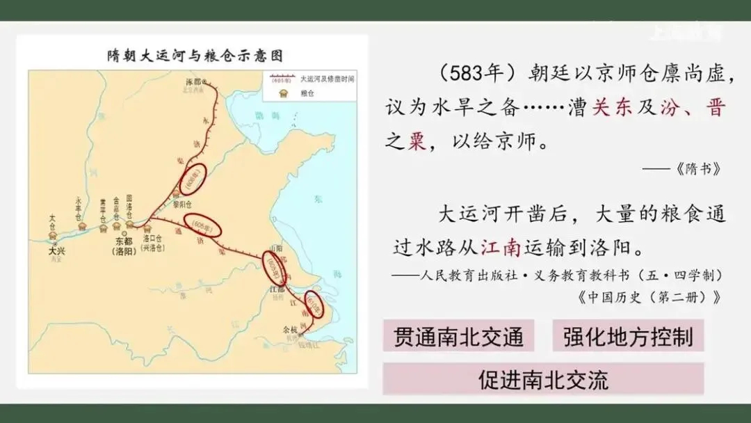 从材料中看,由山东、山西等地变为了江南地区。这些经运河调动的粮食有多少呢?从图中看,在大运河的中心洛阳的周围修建了许多粮仓。以含嘉仓为例,它建有数百个粮窖,总储量可达数亿斤。由此推想,当时洛阳周围粮食储备之多,朝廷对江南地区的物资调动之得力。