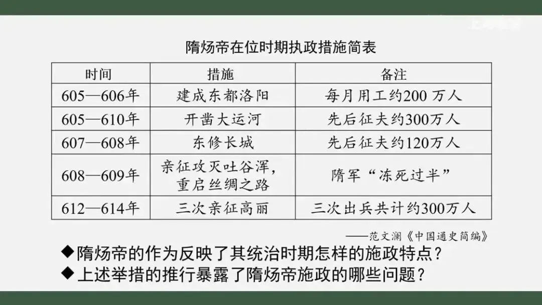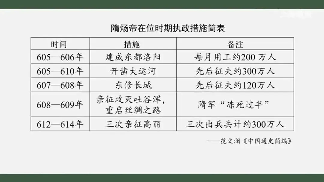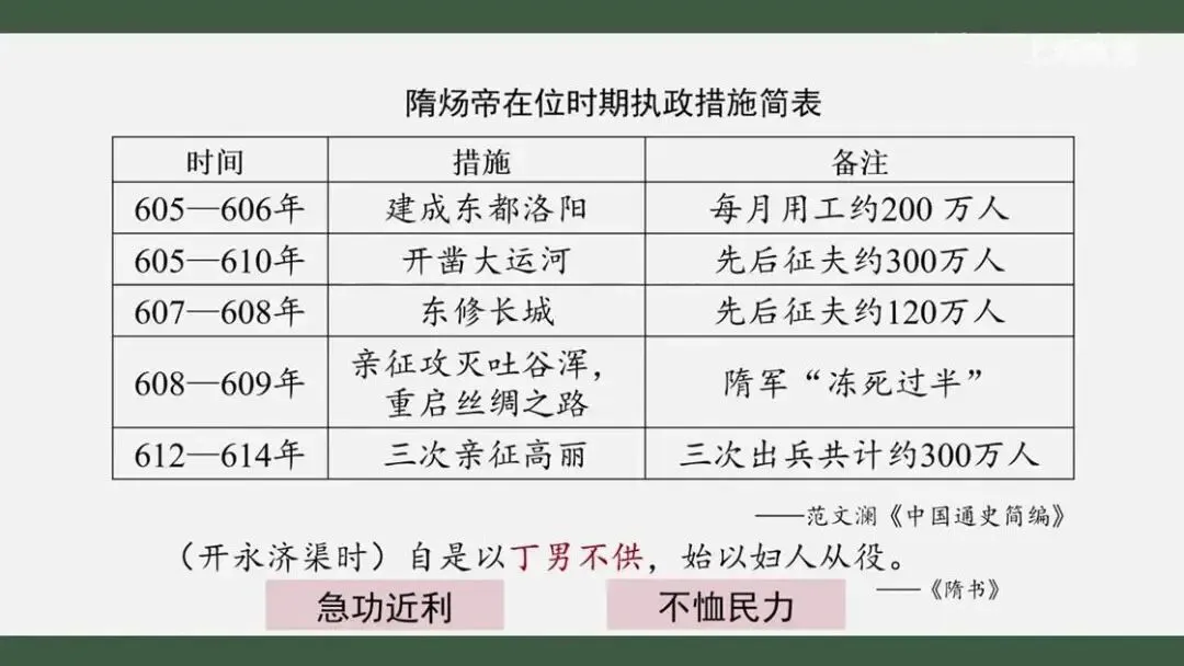 的执政措施反映了他怎样的政治抱负呢?看来,隋炀帝并不是一个安于深宫的皇帝,他不仅开凿大运河沟通南北,还多次亲征边疆,重启丝绸之路,积极维护边疆安定,扩大王朝影响。正如后世感叹的那样,他志包宇宙,拥有满腔抱负,力图创建鸿图大业。不过有句话叫做过犹不及。表格中的信息是否也暴露了隋炀帝施政中存在的显著问题呢?我们从时间上看,隋炀帝施政有怎样的特点呢?