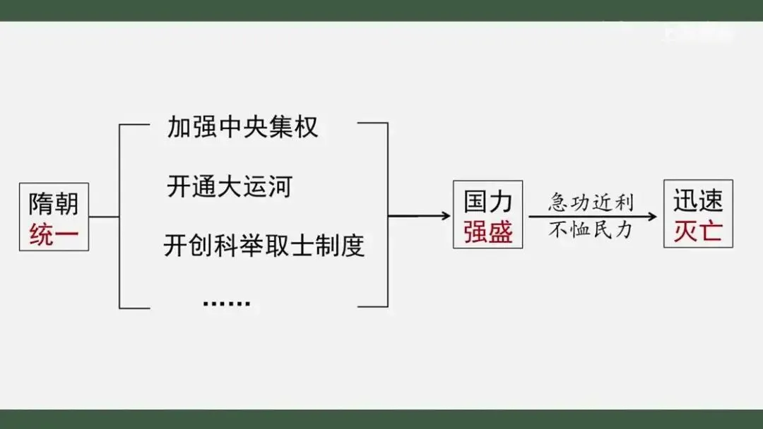 隋朝从统一到灭亡的历史过程,我们就大致梳理完了。回顾这段历程,我们看到隋朝建立后,统治者在政治、经济等方面继承既有经验,采取创新举措,在经历了魏晋南北朝的长期分裂后,再度实现了统一。隋也一度成为国力强盛的王朝,但隋炀帝施政急功近利、不惜民力,使社会矛盾迅速激化,以至二世而亡。