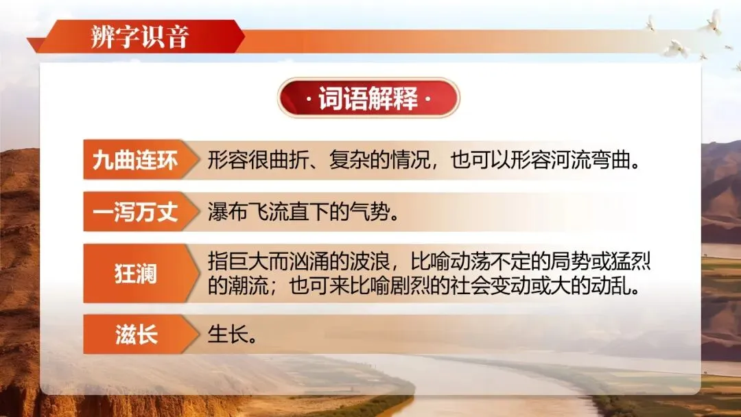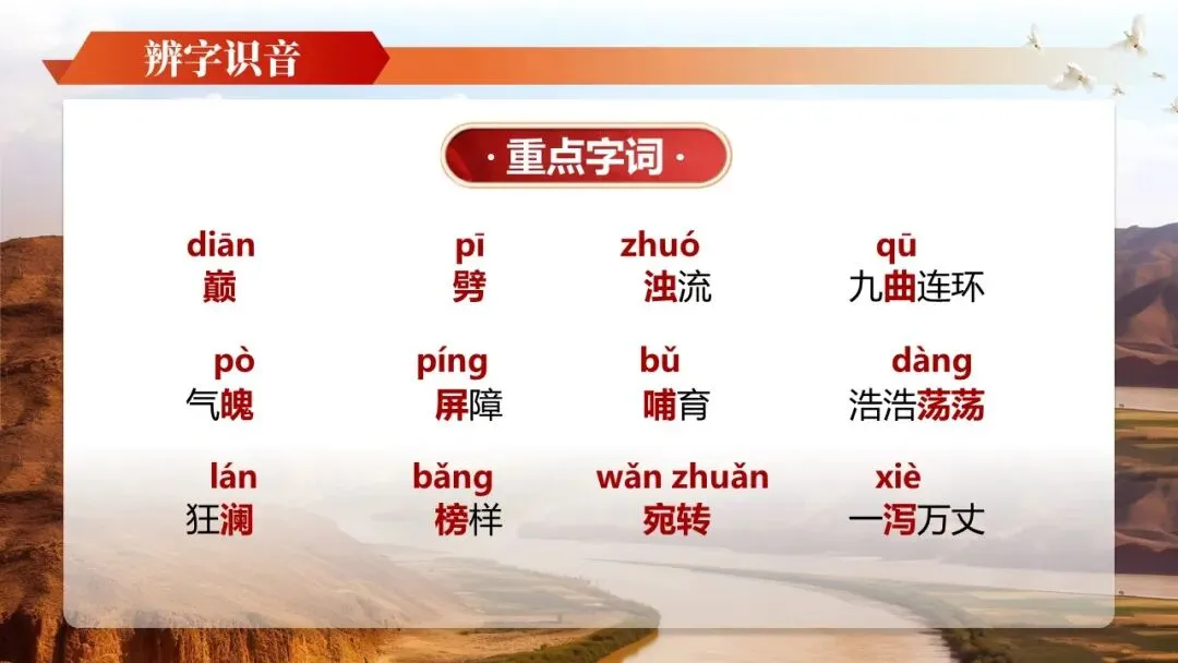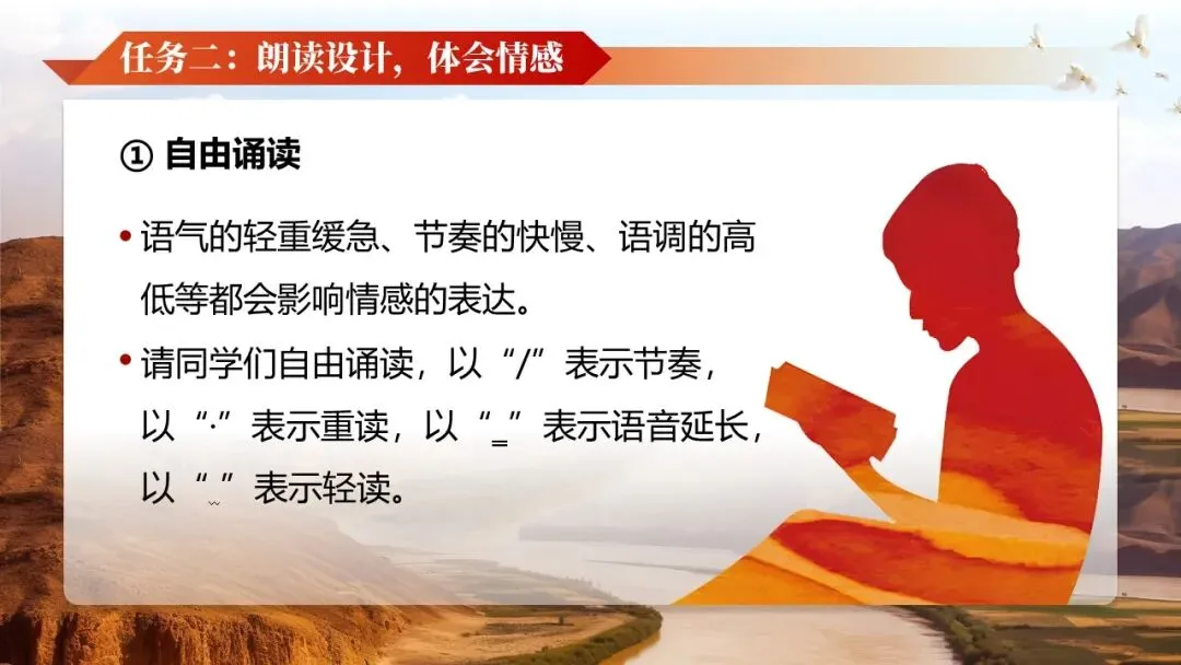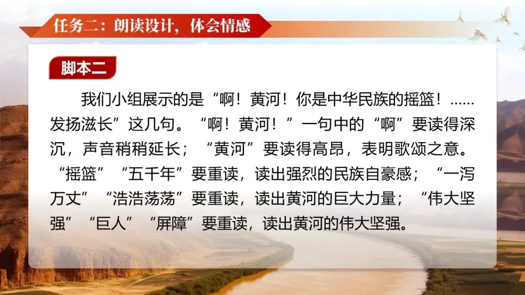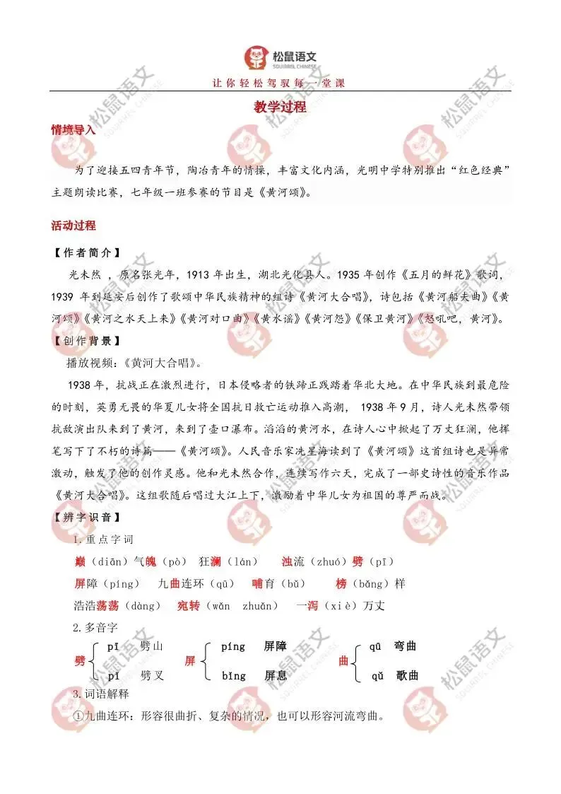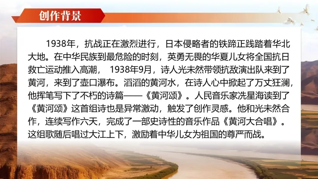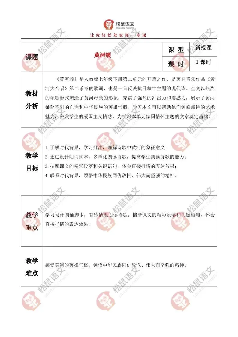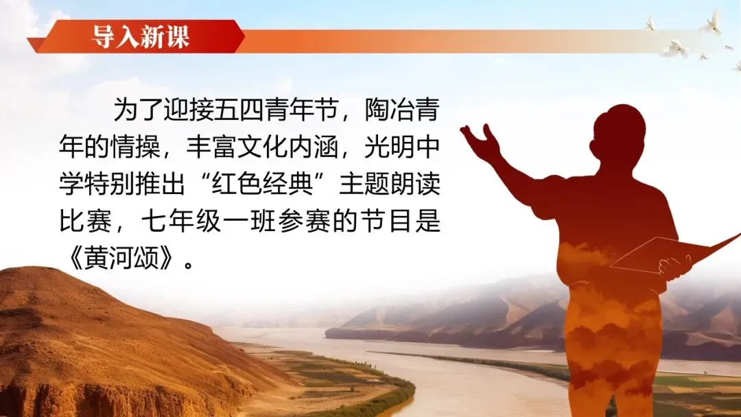 《黄河颂》是人教版七年级下册第二单元的开篇之作,是著名音乐作品《黄河大合唱》第二乐章的歌词,也是一首反映抗日救亡主题的现代诗。全文以热烈的颂歌形式塑造了黄河母亲的形象,充满了强烈的冲击力和震撼力,展示了黄河桀骜不驯的血性和中华民族的英雄气概。学习本文可以帮助他们领略新诗的艺术魅力,激发学生的爱国主义情感,为学习本单元家国情怀主题的文章奠定基础。