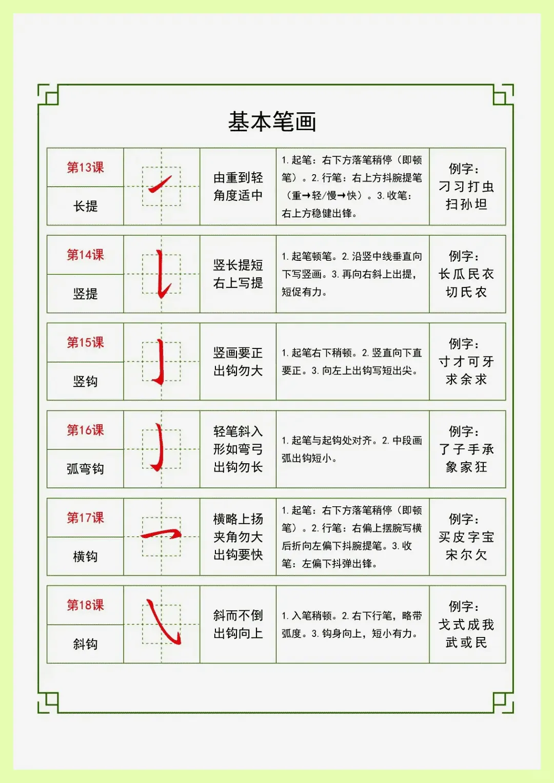 - 难点:部分相似笔画(如横与提、竖与竖钩、撇与捺等)的区分与准确书写,以及笔画在不同汉字中的变化规律。