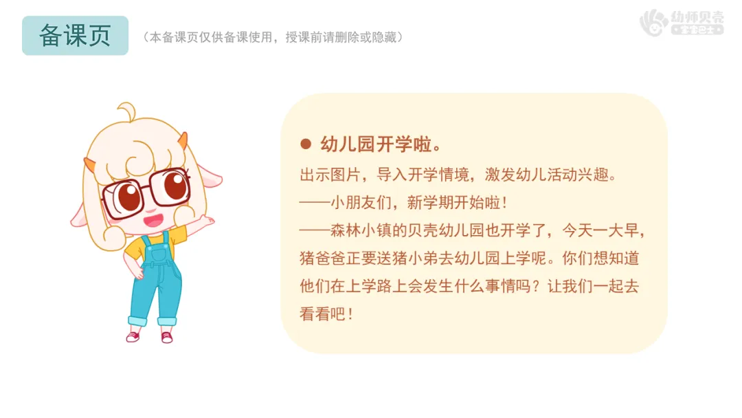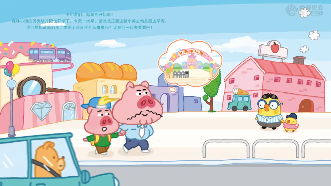 ——森林小镇的贝壳幼儿园也开学了,今天一大早,猪爸爸正要送猪小弟去幼儿园上学呢。你们想知道他们在上学路上会发生什么事情吗?让我们一起去看看吧!