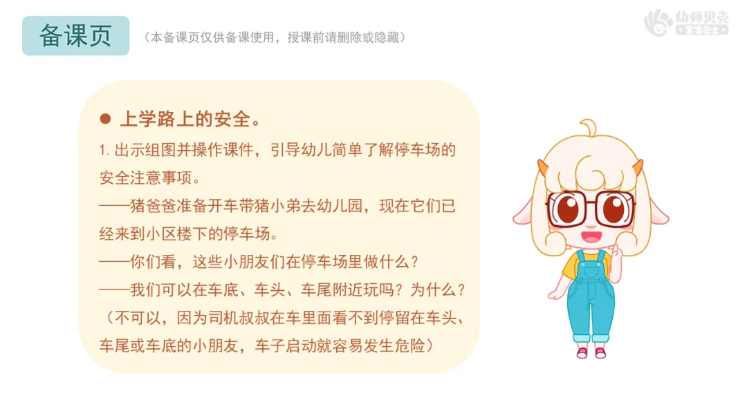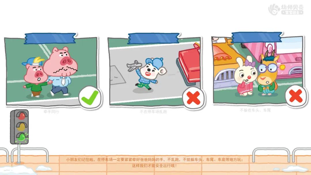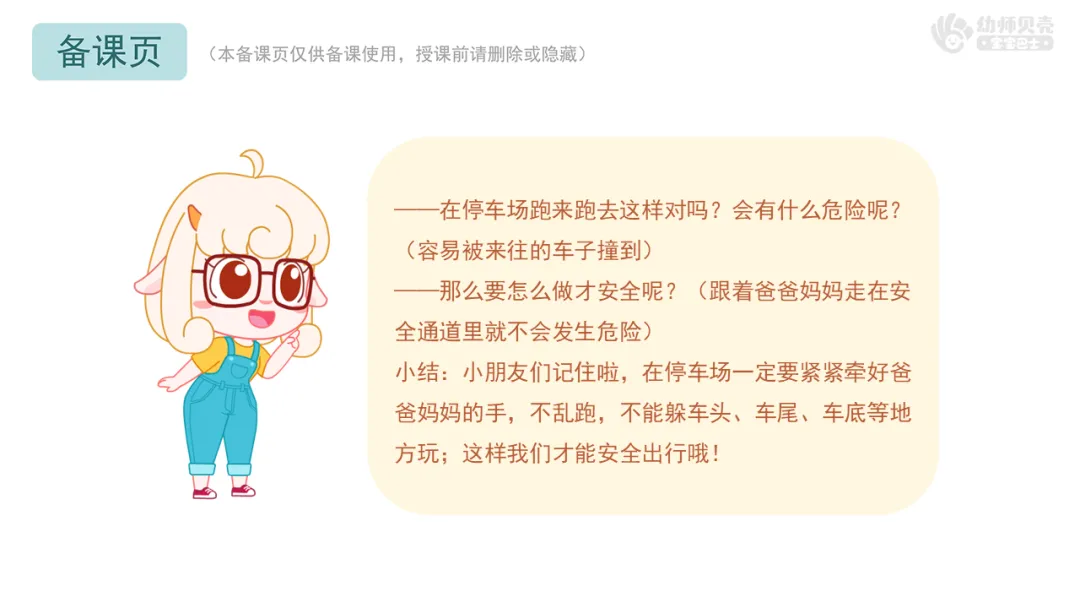 小结:小朋友们记住啦,在停车场一定要紧紧牵好爸爸妈妈的手,不乱跑,不能躲车头、车尾、车底等地方玩;这样我们才能安全出行哦!