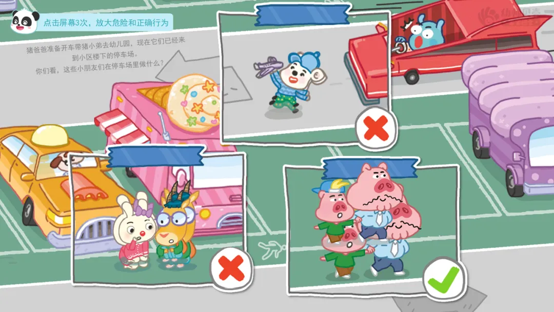 ——在停车场跑来跑去这样对吗?会有什么危险呢?(容易被来往的车子撞到)