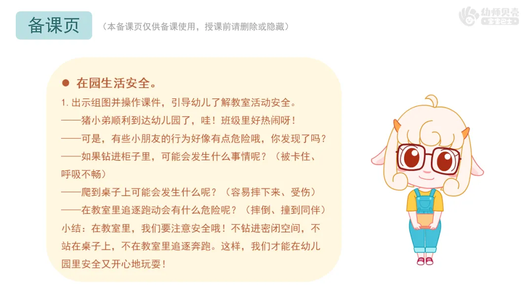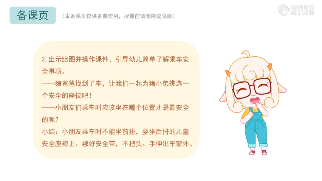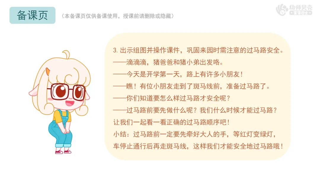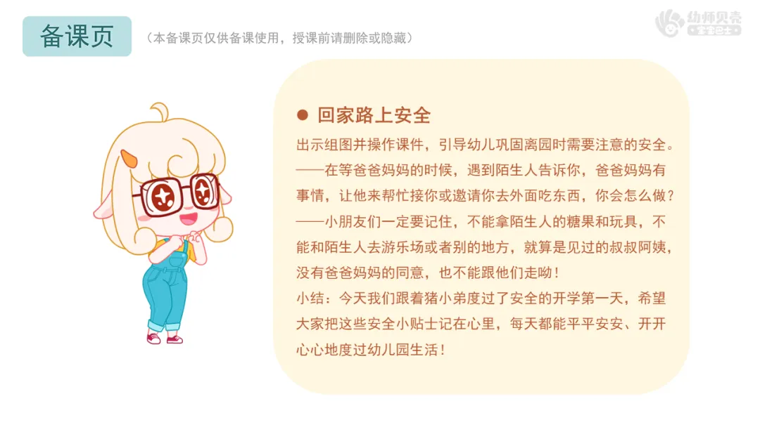 小结:今天我们跟着猪小弟度过了安全的开学第一天,希望大家把这些安全小贴士记在心里,每天都能平平安安、开开心心地度过幼儿园生活!