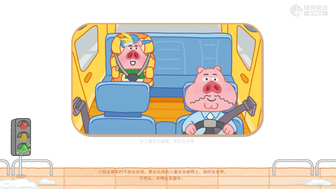 小结:小朋友乘车时不能坐前排,要坐后排的儿童安全座椅上、绑好安全带,不把头、手伸出车窗外。