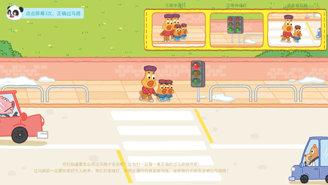 小结:过马路前一定要先牵好大人的手,等红灯变绿灯,车停止通行后再走斑马线,这样我们才能安全地过马路哦!