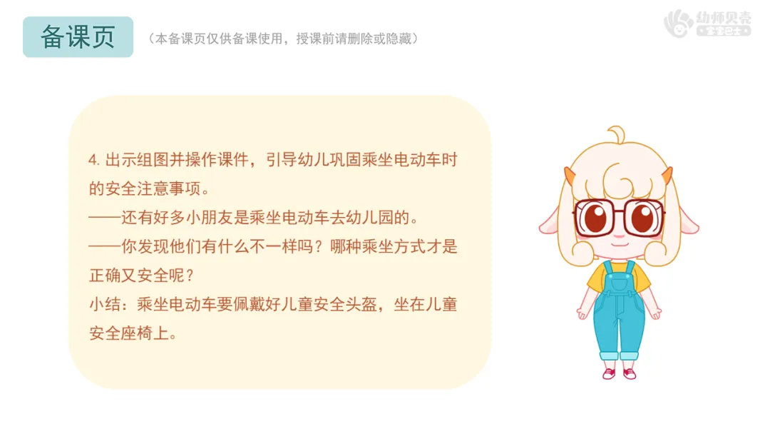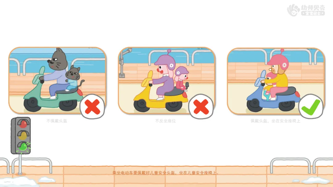 小结:乘坐电动车要佩戴好儿童安全头盔,坐在儿童安全座椅上。