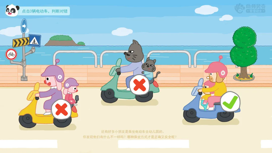 4.出示组图并操作课件,引导幼儿巩固乘坐电动车时的安全注意事项。