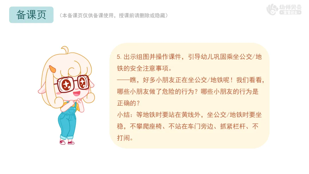 6.出示组图并操作课件,引导幼儿巩固乘坐公交/地铁的安全注意事项。