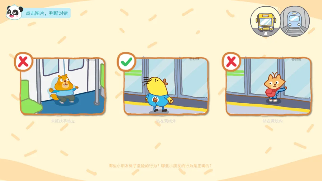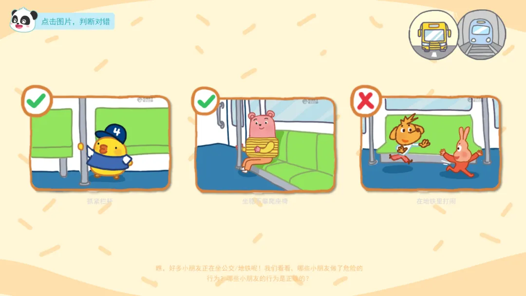 ——瞧,好多小朋友正在坐公交/地铁呢!我们看看,哪些小朋友做了危险的行为?哪些小朋友的行为是正确的?