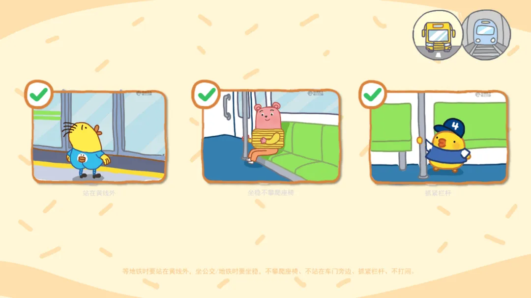 小结:等地铁时要站在黄线外,坐公交/地铁时要坐稳不攀爬座椅、不站在车门旁边、抓紧栏杆、不打闹。