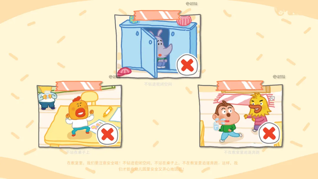 小结:在教室里,我们要注意安全哦!不钻进密闭空间,不站在桌子上,不在教室里追逐奔跑。这样,我们才能在幼儿园里安全又开心地玩耍!