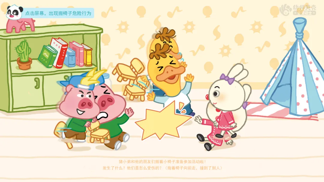 ——推着或拖着椅子走、将椅子举过头顶、抱着椅子在活动室追逐或奔跑、重重地放椅子……这些行为不仅容易让自己受伤,也很容易伤害其他小朋友。