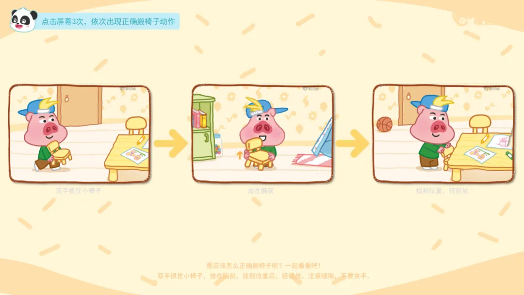 小结:双手抓住小椅子,放在胸前,找到位置后,轻轻放。注意缝隙,不要夹手。