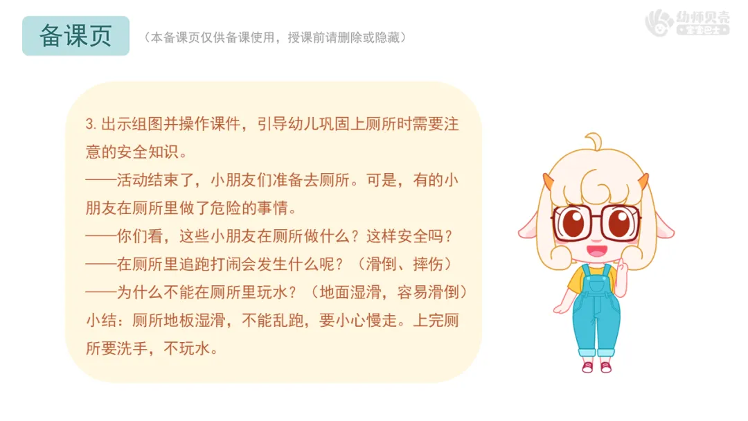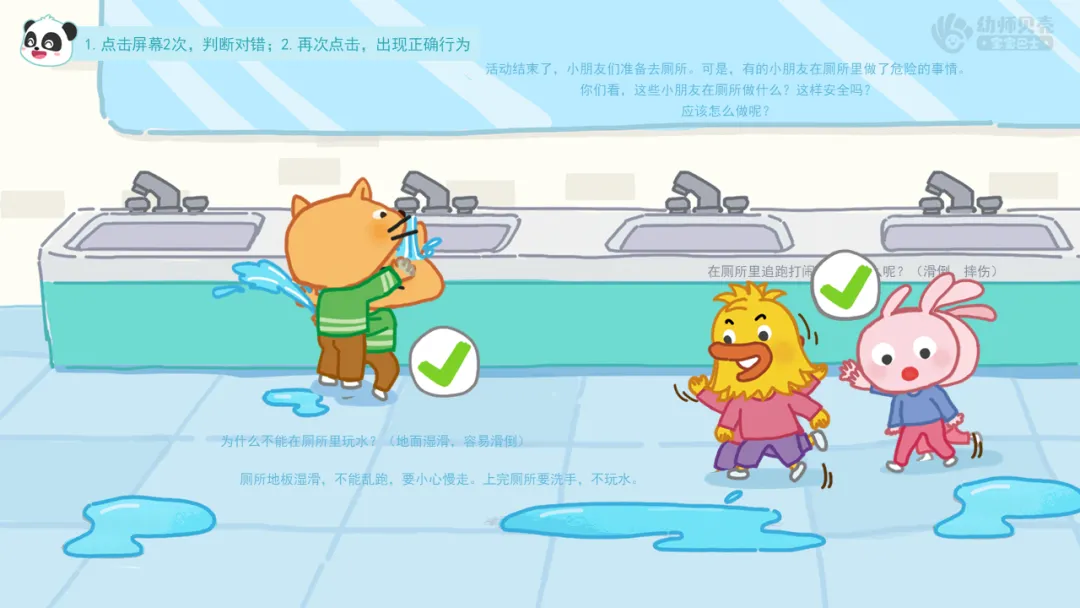 小结:厕所地板湿滑,不能乱跑,要小心慢走。上完厕所要洗手,不玩水。