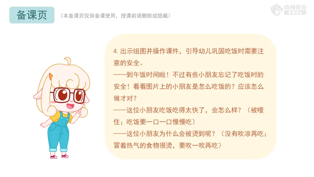 4.出示组图并操作课件,引导幼儿巩固吃饭时需要注意的安全。