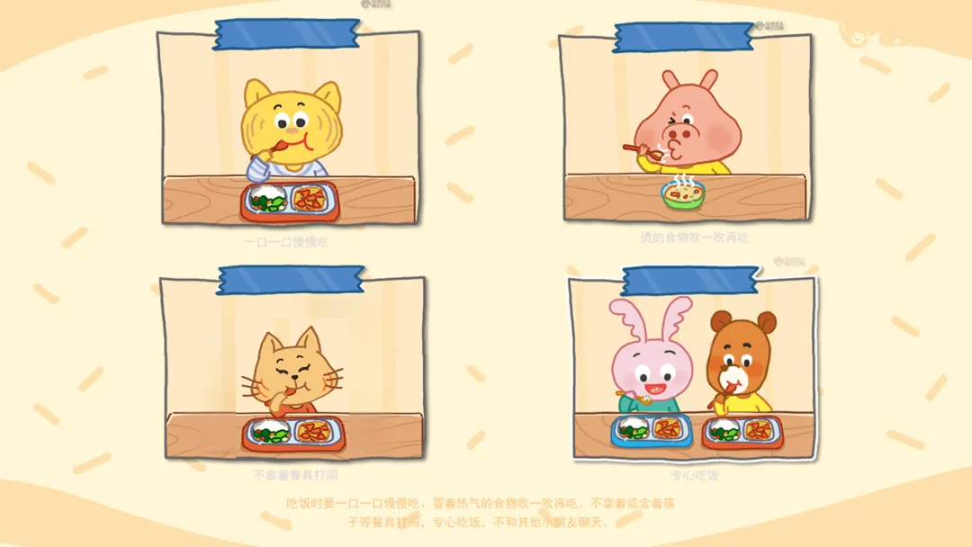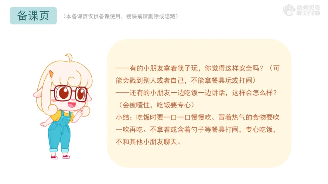 小结:吃饭时要一口一口慢慢吃、冒着热气的食物吹一吹再吃、不拿着或含着筷子等餐具打闹,专心吃饭,不和其他小朋友聊天