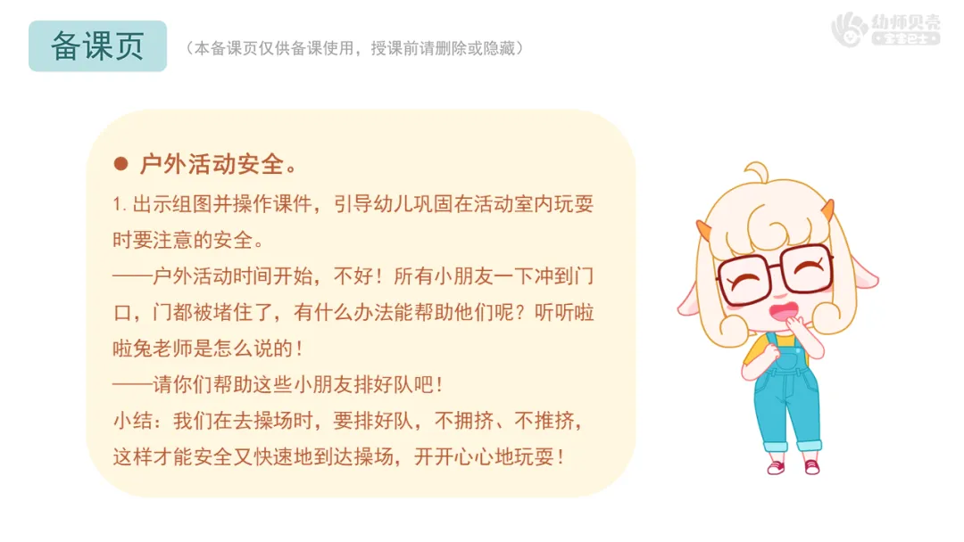 小结:我们在去操场时,要排好队,不拥挤、不推挤,这样才能安全又快速地到达操场,开开心心地玩耍!