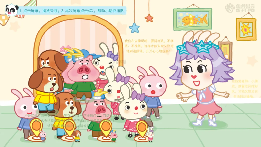 ——户外活动时间开始,不好!所有小朋友一下冲到门口,门都被堵住了,有什么办法能帮助他们呢?听听啦啦兔老师是怎么说的!