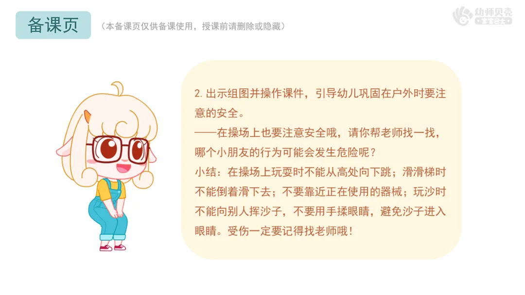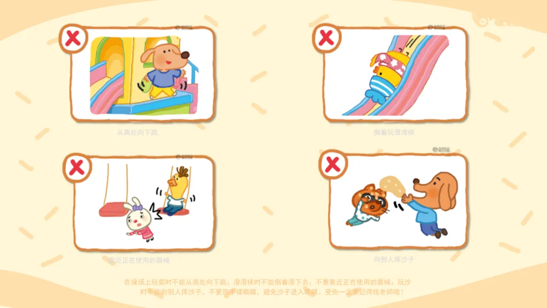 小结:在操场上玩耍时不能从高处向下跳;滑滑梯时不能倒着滑下去;不要靠近正在使用的器械;玩沙时不能向别人挥沙子,不要用手揉眼睛,避免沙子进入眼睛。受伤一定要记得找老师哦!