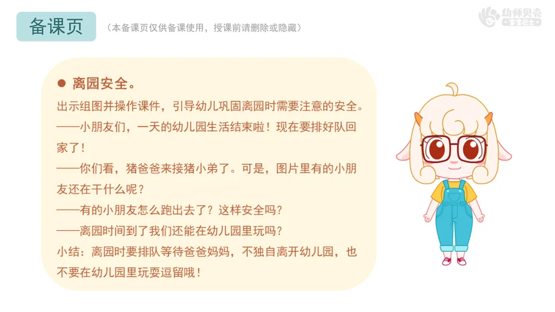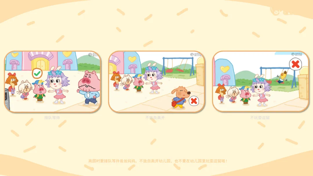 小结:离园时要排队等待爸爸妈妈,不独自离开幼儿园,也不要在幼儿园里玩耍逗留哦!