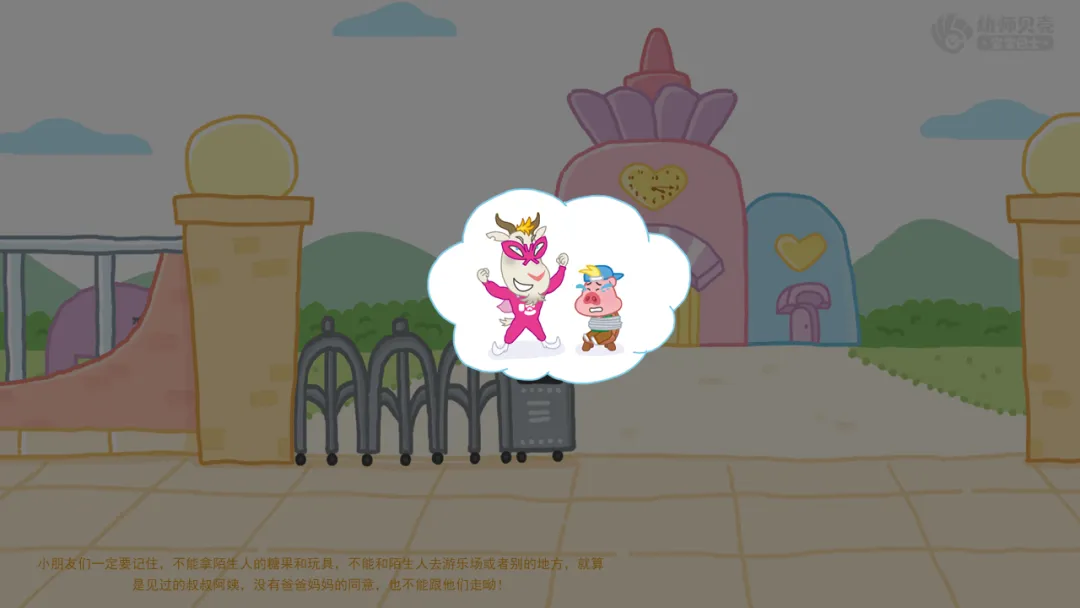 ——小朋友们一定要记住,不能拿陌生人的糖果和玩具,不能和陌生人去游乐场或者别的地方,就算是见过的叔叔阿姨,没有爸爸妈妈的同意,也不能跟他们走呦!