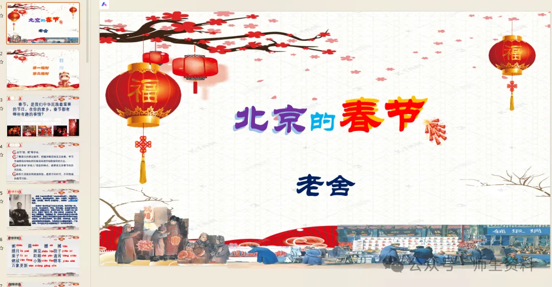 •总结课文主旨:作者通过描写老北京春节的完整习俗,展现了春节的热闹氛围与民俗魅力,表达了对传统文化的喜爱与珍视。
