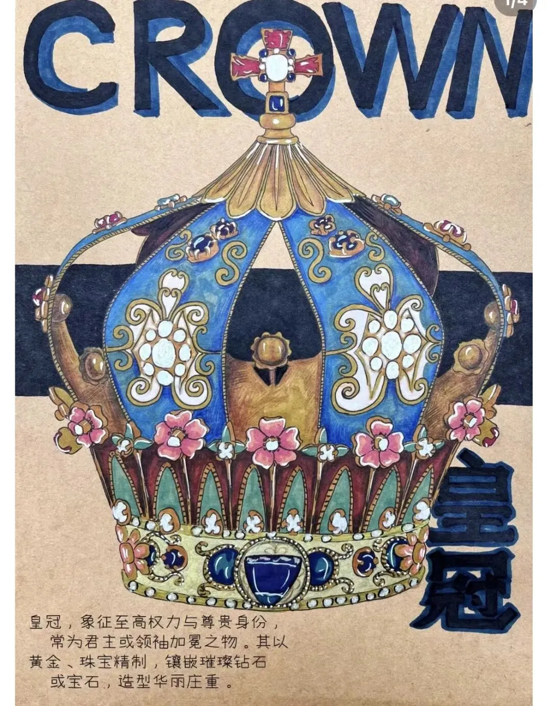 - 重点:皇冠的整体造型构图,运用多种线条、图案装饰皇冠,做到饱满美观。