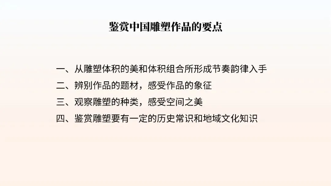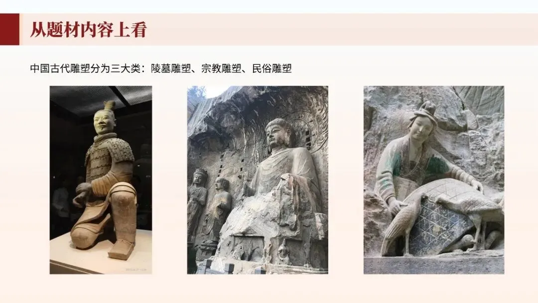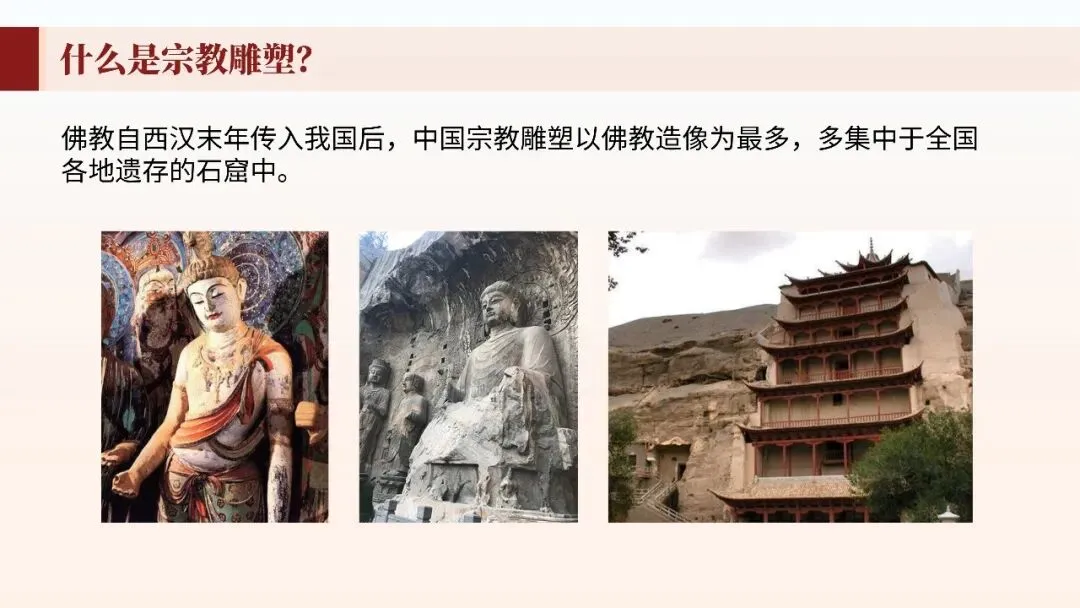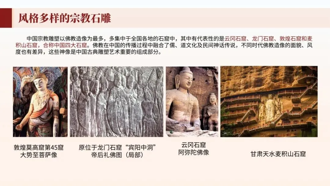 本节从陶俑、石窟造像到寺院雕塑、民间工艺,系统梳理中国雕塑发展历程。理解中国雕塑"以意写形"、注重神韵传达的审美特征,赏析泥塑、石雕、木雕等不同材质的表现手法,培养三维空间造型审美能力。