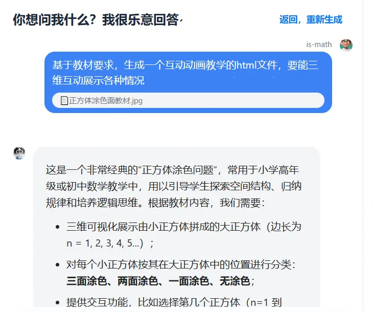 1.首次提示词:“基于教材要求,生成一个互动动画教学的html文件,要能三维互动展示各种情况。”