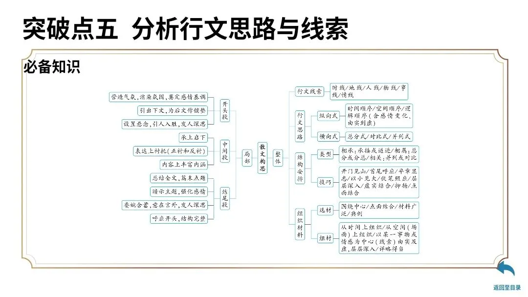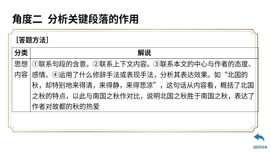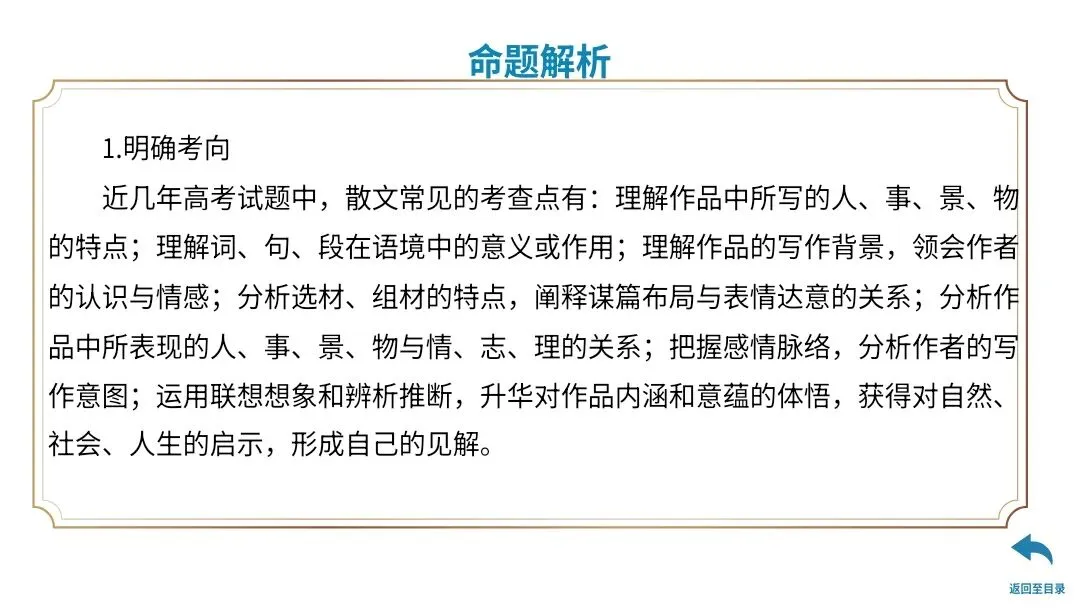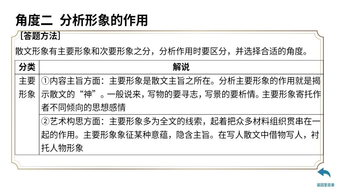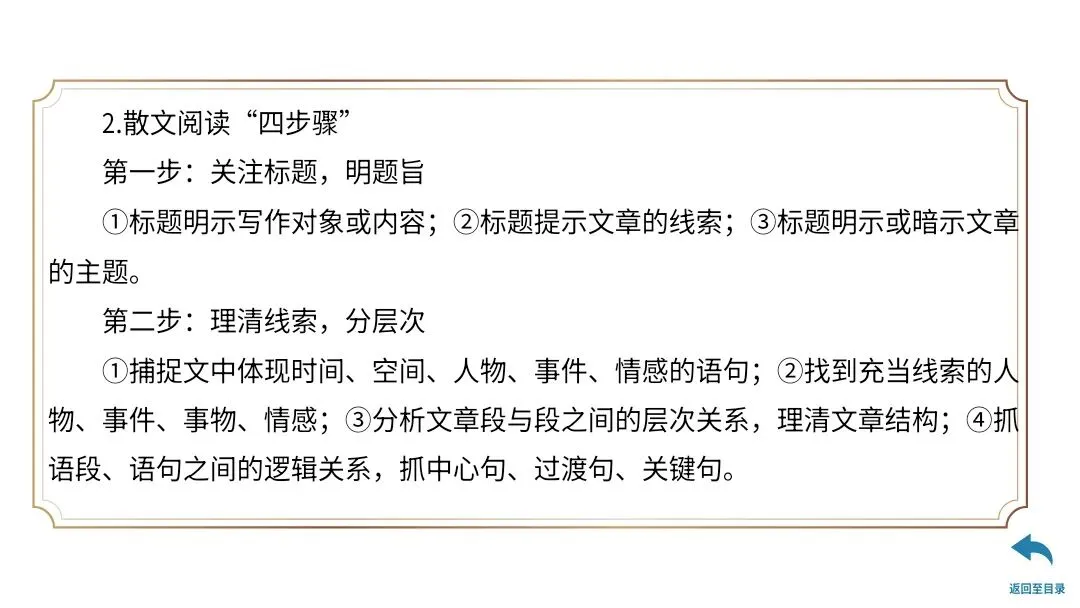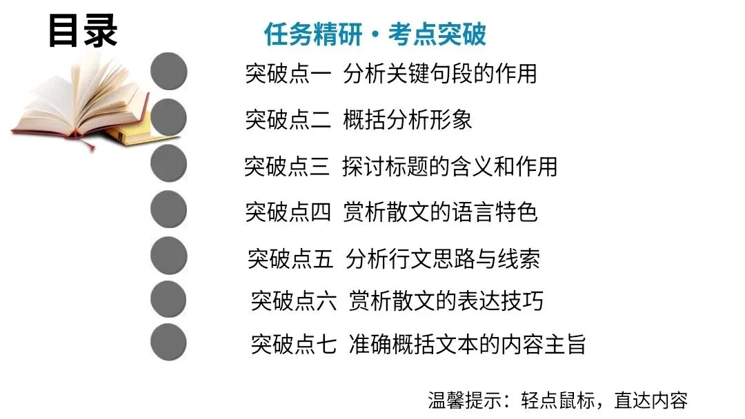 【26届高考语文二轮专题复习】散文阅读课件(1.分析关键句段的作用,2.概括分析形象,3.探讨标题的含义和作用,4.赏析散文的语言特色,5.分析行文思路与线索,6.赏析散文的表达技巧,7.准确概括散文的内容主旨)课件