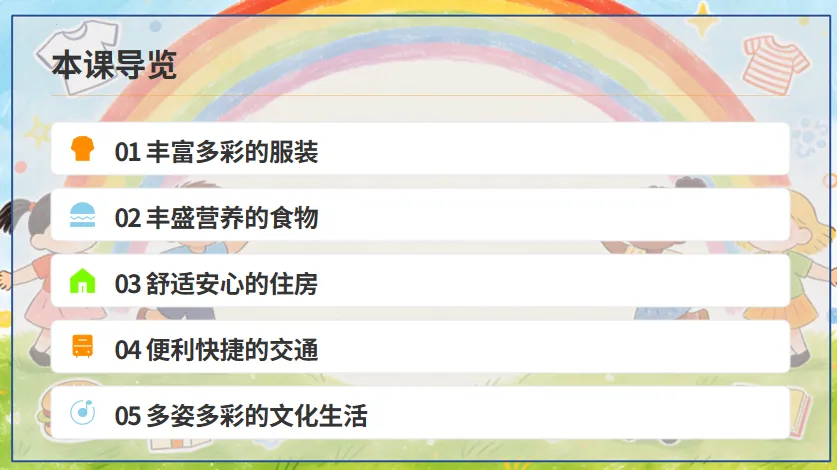 1.了解服装、食物、住房、交通、文化生活五个方面的发展变化,知道现在的生活从“实用满足” 走向 “品质提升”,能说出不同场景下的生活特点,感知幸福生活的具体表现。