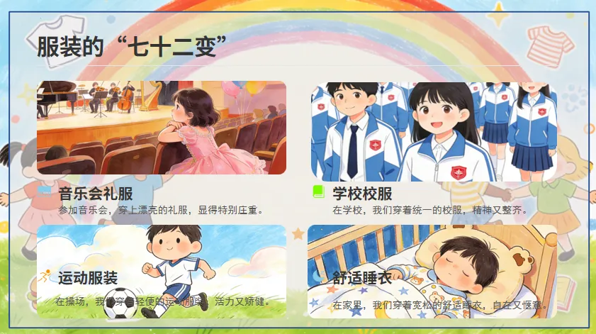 2.实物道具:准备音乐会礼服、校服、运动服、睡衣的迷你模型或实物样品,携带 1-2 种常见家乡美食(如麻花、桂花糕)供学生观察品尝。